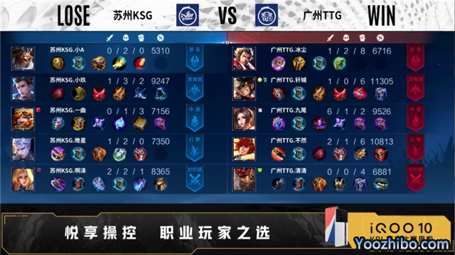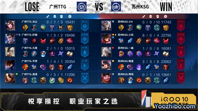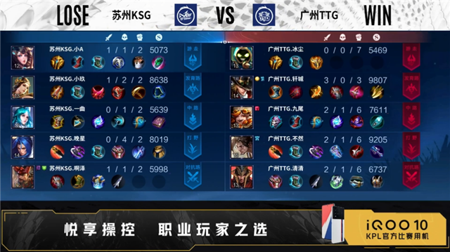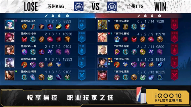 开局双方正常抢线。1分18秒中路广州TTG击杀不知火舞,拿下一血。2分20秒河道广州TTG击杀不知火舞,拿下暴君。3分31秒苏州KSG拿下主宰,中路广州TTG击杀不知火舞,双方打出1换1。5分45秒苏州KSG摧毁敌方对抗路外塔,广州TTG摧毁敌方发育路外塔。6分11秒河道广州TTG击杀镜,猪八戒二连击破,打出1换2。6分58秒中路苏州KSG击杀金蝉,拿下暴君,摧毁敌方中路外塔、发育路外塔。8分23秒中路广州TTG击杀伽罗,曜二连击破,打出0换2,拿下主宰,摧毁敌方对抗路外塔、发育路二塔。10分06秒发育路广州TTG击杀夏侯惇,双方打出2换2。10分46秒苏州KSG拿下暗影主宰,广州TTG拿下暗影暴君。11分28秒中路广州TTG击杀蔡文姬,打出0换2。15分02秒中路苏州KSG击杀金蝉,打出1换1,广州TTG拿下暗影暴君。16分40秒对抗路广州TTG击杀不知火舞,摧毁敌方对抗路二塔、中路外塔、中路二塔。17分33秒广州TTG拿下暗影主宰。18分59秒广州TTG摧毁敌方对抗路高地、发育路高地,拿下暗影暴君。20分29秒中路广州TTG击杀猪八戒,曜四连超凡,团灭对手摧毁水晶拿下比赛。