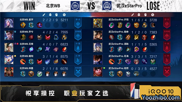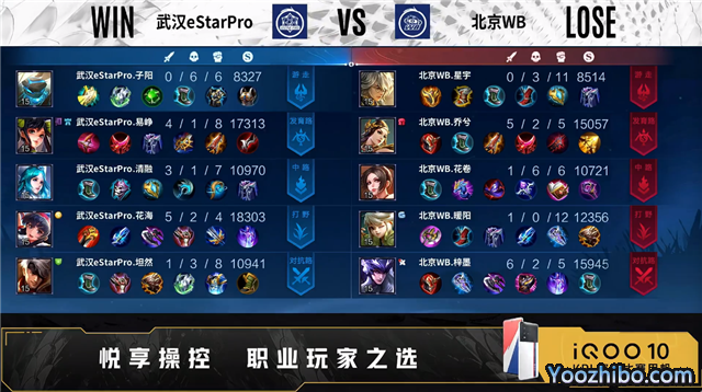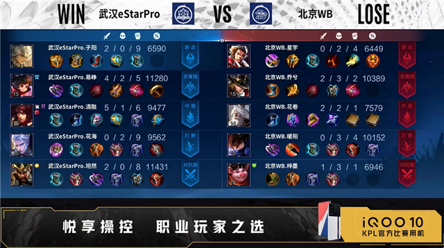 双方常规开局。1分15秒野区团战武汉eStar打出1换2。1分33秒双方对抗路1换1。3分04秒双方发育路1换1。3分52秒野区团战北京WB打出0换3。5分41秒北京WB摧毁敌方中路外塔。6分05秒中路团战武汉eStar打出0换2。8分03秒发育路团战北京WB打出0换3。9分44秒野区团战北京WB击杀鬼谷子。9分53秒北京WB摧毁敌方对抗路二塔。10分29秒对抗路团战北京WB打出0换5。10分53秒北京WB摧毁敌方水晶拿下比赛。