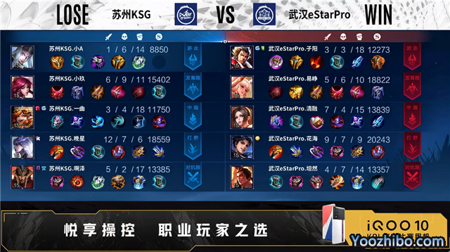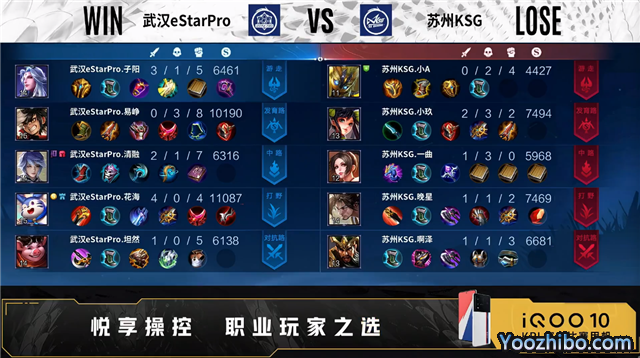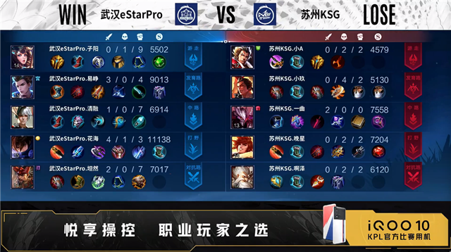 双方常规开局。1分47秒对抗路团战苏州KSG打出0换2。2分35秒野区团战武汉eStare打出1换3。3分07秒苏州KSG野区击杀曜。3分35秒双方发育路1换1。4分40秒武汉eStar发育路击杀伽罗。5分11秒武汉eStar拿下暴君。5分36秒苏州KSG摧毁敌方中路外塔。7分22秒野区团战苏州KSG打出1换2。8分24秒苏州KSG野区击杀曜。9分35秒中路团战苏州KSG打出1换3。11分40秒苏州KSG中路打出0换2。11分56秒苏州KSG对抗路打出2换5。13分38秒高地团战武汉eStar打出2换3。15分04秒主宰处团战苏州KSG打出2换3。15分58秒高地团战双方1换1。17分23秒中路团战武汉eStar打出2换3。17分50秒武汉eStar拿下暗影主宰。18分44秒武汉eStar拿下暗影暴君。19分13秒武汉eStar摧毁敌方对抗路二塔。20分58秒双方野区打野互换。22分17秒中路团战武汉eStar打出2换4。22分58秒武汉eStar拿下风暴龙王。24分13秒高地团战武汉eStar打出0换5。24分32秒武汉eStar摧毁敌方水晶拿下比赛。