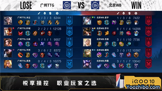 双方常规开局。3分06秒北京WB中路击杀东皇太一拿到一血。3分40秒北京WB拿下暴君。3分55秒广州TTG发育路击杀后羿。5分30秒双方对抗路1换1。5分39秒广州TTG中路击杀后羿。5分59秒广州TTG摧毁敌方发育路外塔。6分14秒广州TTG对抗路击杀夏洛特。7分35秒发育路双方1换1。8分25秒北京WB对抗路打出0换2。9分30秒中路团战北京WB打出1换2。9分59秒北京WB摧毁敌方中路外塔。10分59秒中路团战广州TTG打出2换4。12分34秒广州TTG拿下暗影主宰。13分18秒北京WB中路打出0换2。13分55秒北京WB野区击杀关羽。14分03秒北京WB摧毁敌方中路二塔。15分22秒暴君处团战北京WB击杀东皇太一,广州TTG抢到暗影暴君。16分28秒北京WB对抗路击杀干将莫邪。16分49秒北京WB摧毁敌方中路高地塔。17分14秒北京WB摧毁敌方对抗路高地塔。17分40秒北京WB强点水晶拿下比赛。