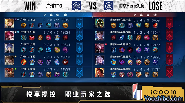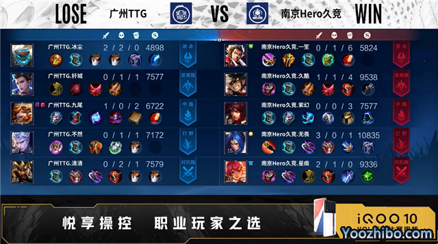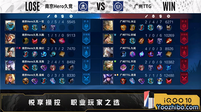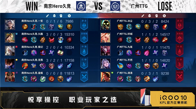 双方常规开局。6分42秒南京Hero发育路击杀太乙真人拿到一血。7分59秒南京Hero摧毁敌方发育路二塔。8分11秒广州TTG中路下河道击杀澜。11分57秒南京Hero拿下暗影主宰。12分59秒中路团战南京Hero打出1换3。15分40秒南京Hero暴君处击杀吕布。16分31秒南京Hero摧毁敌方对抗路二塔。17分26秒南京Hero摧毁敌方发育路高地塔。20分54秒野区团战南京Hero打出0换2。21分31秒南京Hero强点水晶拿下比赛。