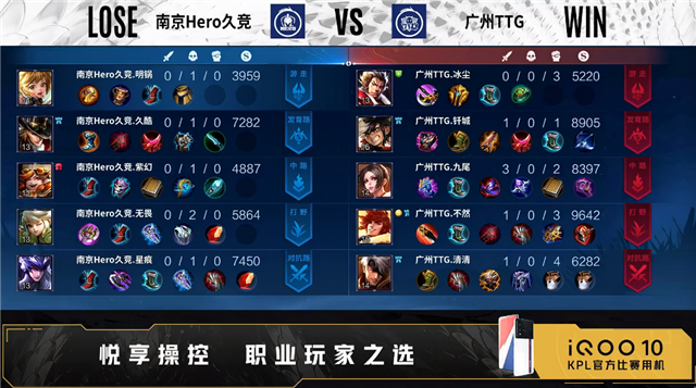 双方常规开局。2分15秒广州TTG拿下暴君,团战南京Hero击杀猪八戒拿到一血。2分35秒南京Hero关羽中路越塔击杀周瑜。4分28秒中路下河道团战双方1换1。4分58秒发育路团战广州TTG打出1换2。6分34秒南京Hero拿下暴君。6分54秒广州TTG摧毁敌方对抗路外塔。7分25秒广州TTG野区击杀不知火舞。10分19秒广州TTG拿下暗影主宰,南京Hero拿下暗影暴君。11分48秒南京Hero野区打出0换2。13分38秒广州TTG野区击杀铠。14分19秒广州TTG拿下暗影暴君。15分05秒广州TTG中路上河道击杀不知火舞。15分31秒广州TTG拿下暗影主宰。16分27秒广州TTG发育路打出2换5,澜拿到五连绝世。16分52秒广州TTG摧毁敌方水晶拿下比赛。