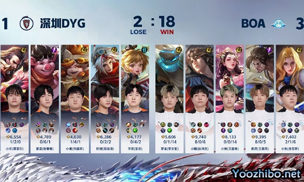 十一分左右,BOA拿到暗影暴君。十三分左右,双方经济差来到6K。十四分左右,深圳DYG先手开团,BOA立刻反打击杀对方四人,顺着兵线,击破水晶,拿到本局比赛的胜利,率先来到赛点!