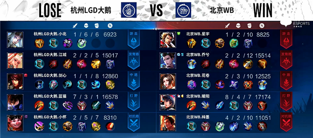 2分24秒镜拿下暴君。3分钟中路团战,镜拿下一血,杭州LGD大鹅打出0换2。4分30秒下路团战,双方1换1。6分50秒曜拿下暴君,嬴政推掉下路一塔。10分20秒杭州LGD大鹅上路一塔被破。10分30秒曜拿下暴君,镜拿下主宰。12分20秒野区团战,双方1换1。12分51秒蒙恬被击杀,镜拿下暴君。14分40秒曜拿下主宰。15分08秒曜拿下暴君。15分30秒虞姬推掉下路高地塔。16分15秒中路团战,北京WB打出1换3。18分20秒主宰团,北京WB团灭杭州LGD大鹅。18分59秒北京WB推掉水晶拿下本场比赛胜利。