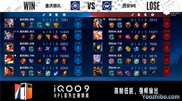 双方常规开局。1分01秒西安WE反到蓝BUFF。2分04秒重庆狼队发育路击杀太乙真人拿到一血。2分30秒重庆狼队拿下暴君。4分39秒重庆狼队摧毁敌方发育路外塔。5分23秒野区团战西安WE击杀盾山。6分53秒西安WE野区击杀百里守约。7分25秒西安WE拿下暴君。10分21秒重庆狼队拿下暗影主宰。11分04秒重庆狼队摧毁敌方中路外塔、二塔。12分09秒西安WE发育路击杀梦奇。12分35秒重庆狼队抢到暗影暴君并打出0换3。13分16秒重庆狼队团灭对手摧毁水晶拿下比赛。