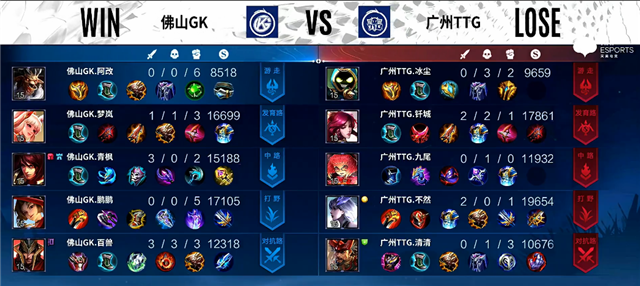 1分35秒下路交火,伽罗拿下一血。1分40秒上路团战,蒙恬被击杀。3分20秒镜拿下暴君。4分52秒公孙离推掉下路一塔。5分钟镜拿下暴君。6分34秒伽罗被击杀。9分钟云缨拿下主宰。10分36秒镜拿下主宰,团战佛山GK打出1换2。14分钟镜拿下暴君,廉颇被击杀。15分钟云缨拿下主宰。16分钟双方互换边路二塔。16分25秒云缨拿下暴君。22分10秒野区团战,太乙真人被击杀。23分钟云缨拿下风暴龙王。24分24秒公孙离推掉上路高地塔。24分58秒蒙恬推掉中路高地塔。26分45秒云缨推掉水晶拿下本场比赛胜利。