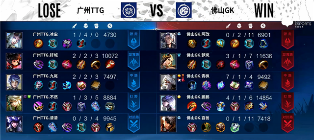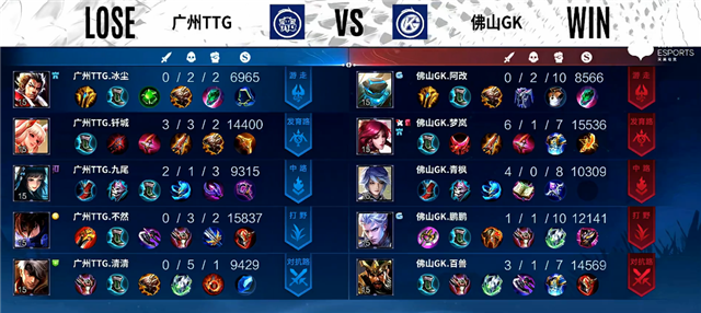 2分20秒暴君团,虞姬拿下一血,镜拿下暴君。5分钟马超推掉下路一塔。5分25秒野区团战,广州TTG打出0换2。6分40秒河道团战,佛山GK打出1换3。7分12秒广州TTG中路一塔被破。8分钟镜拿下暴君。9分20秒野区团战,佛山GK打出2换3。10分20秒镜拿下暴君。11分10秒镜拿下主宰。12分30秒高地团,东皇太一被击杀,虞姬推掉上路高地塔。13分20秒虞姬推掉中路高地塔,马超被击杀。14分12秒镜拿下暴君。15分45秒佛山GK推掉水晶率先拿下赛点。