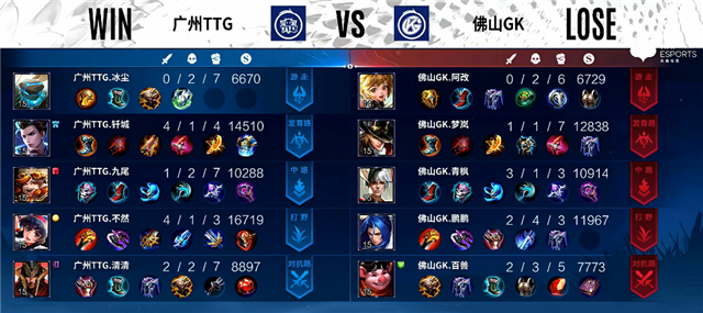 50秒下路交火,孙尚香拿下一血,双方1换1。3分40秒下路团战,百里守约被击杀。4分钟吕布推掉上路一塔。4分50秒孙尚香推掉下路一塔。5分钟澜拿下暴君。7分钟中路团战,佛山GK打出1换2。6分钟澜拿下主宰。10分钟百里守约推掉中路一塔。11分10秒裴擒虎拿下暴君。12分钟下路团战,广州TTG打出1换2。13分钟裴擒虎拿下主宰。15分22秒裴擒虎拿下暴君。17分钟裴擒虎拿下主宰。19分19秒裴擒虎拿下暴君。20分45秒河道团战,广州TTG打出2换5,裴擒虎拿下四杀。21分37秒广州TTG推掉水晶率先拿下一分。