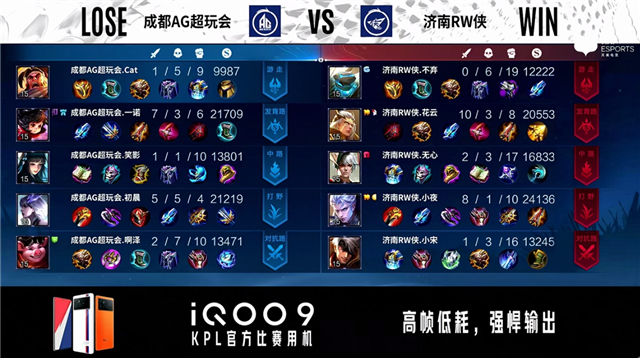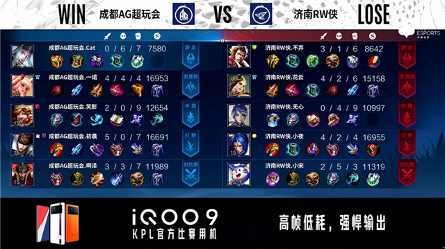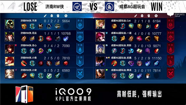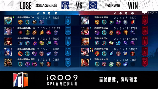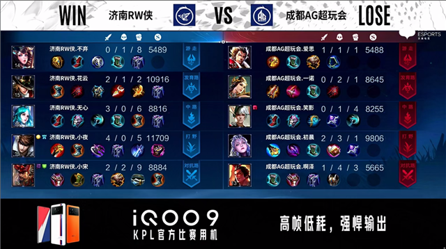 3分36秒,成都AG拿下暴君,济南RW侠镜像拿下先知主宰。3分55秒,成都AG下路击杀盾山。4分40秒,成都AG野区击杀后羿,中路击杀夏侯惇。5分12秒,成都AG破掉济南RW侠下一塔。5分36秒,成都AG破掉济南RW侠中一塔。6分钟,野区团,济南RW侠打出0换2。6分38秒,济南RW侠破掉成都AG中一塔。8分42秒,济南RW侠拿下暴君。9分19秒,主宰团,成都AG打出0换3,随后破掉济南RW侠上二塔和中二塔。10分12秒,成都AG拿下暗影主宰。11分20秒,中路团,济南RW侠打出0换2。12分05秒,成都AG拿下暗影暴君。13分57秒,成都AG拿下暗影主宰。14分59秒,济南RW侠中路击杀苏烈。15分48秒,成都AG镜抢下暗影暴君。16分10秒,中路团,双方打出4换4,随后成都AG破掉济南RW侠中路高地塔。17分43秒,成都AG拿下暗影主宰。18分30秒,高地团,双方1换1。19分30秒,成都AG拿下暗影暴君。21分20秒,成都AG拿下风暴龙王,随后团战济南RW侠打出1换3。22分钟,济南RW侠破掉成都AG中二塔。22分37秒,中路团,济南RW侠打出1换2。23分54秒,成都AG野区击杀盾山。25分08秒,成都AG拿下风暴龙王。26分30秒,中路团,双方打出1换1。29分钟,中路团,济南RW侠打出1换4,随后中路一波摧毁水晶赢下本场比赛的胜利。