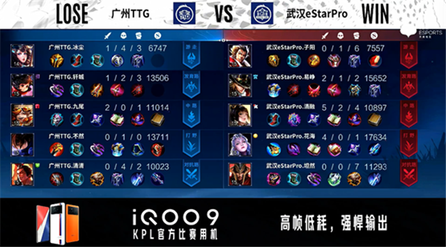 开局50秒广州TTG对抗路击杀张飞拿到一血。1分18秒武汉eStar拿下中路河道之灵。1分27秒武汉eStar发育路击杀吕布拿到一血。2分20秒武汉eStar发育路击杀吕布。2分57秒武汉eStar对抗路打出0换2。3分47秒武汉eStar拿下暴君。4分25秒广州TTG野区击杀马可波罗。5分20秒武汉eStar中路击杀大乔。6分10秒双方野区1换1。7分25秒武汉eStar摧毁敌方对抗路二塔。7分46秒武汉eStar摧毁敌方中路外塔,广州TTG击杀上官婉儿。6分31秒武汉eStar拿下暴君。9分28秒武汉eStar野区击杀吕布。10分17秒武汉eStar拿下暗影主宰。11分37秒武汉eStar摧毁敌方发育路高地塔。12分52秒武汉eStar拿下暗影主宰。13分09秒武汉eStar发育路击杀大乔。13分55秒武汉eStar发育路击杀澜。14分31秒武汉eStar拿下暗影主宰。15分33秒武汉eStar摧毁敌方中路高地塔。16分50秒武汉eStar拿下暗影暴君。18分47秒武汉eStar拿下暗影主宰。19分28秒高地团战武汉eStar打出0换2。19分54秒武汉eStar摧毁敌方水晶拿下比赛。