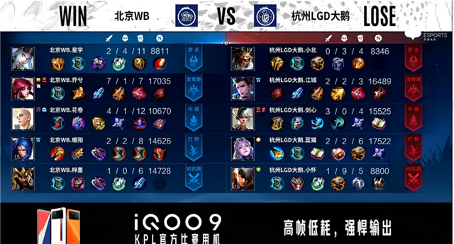 2分58秒,北京WB上路击杀夏侯惇拿下一血。3分50秒,北京控下暴君,杭州LGD大鹅镜像控下先知主宰。5分46秒,北京WB和杭州LGD大鹅互换边塔一塔。6分25秒,野区团,北京WB打出0换2。8分08秒,北京WB控下暴君,野区团,北京WB击杀夏侯惇。8分45秒,北京WB先后破掉杭州LGD大鹅下二塔和中一塔。8分18秒,北京WB控下主宰。9分50秒,杭州LGD大鹅破掉北京WB中一塔。11分18秒,北京WB控下暗影暴君。11分20秒,主宰团,双方打出1换1,随后杭州LGD大鹅控下暗影主宰。12分40秒,中路团,北京WB打出1换2。13分28秒,北京WB破掉杭州LGD大鹅上二塔。14分20秒,野区团,北京WB打出0换2,随后破掉杭州LGD大鹅下路高地塔和中路高地塔。15分36秒,杭州LGD大鹅拿下暗影暴君。16分40秒,中路团,北京WB击杀夏侯惇,随后控下暗影主宰。18分钟,杭州LGD大鹅击杀橘右京。18分30秒,中路团,北京WB击杀夏侯惇。19分21秒,北京WB拿下暗影暴君。20分20秒,上路团,杭州LGD大鹅击杀东皇太一。21分20秒,杭州LGD大鹅控下风暴龙王,随后击杀橘右京。22分11秒,杭州LGD大鹅破掉北京WB中路高地塔。22分40秒,上路团,北京打出3换4,随后北京WB橘右京中路带线一波摧毁水晶让二追三拿下本场比赛胜利。