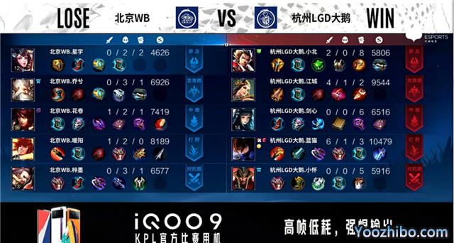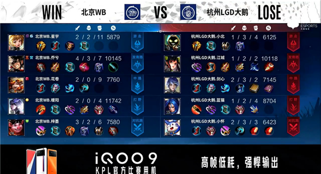 1分钟,杭州LGD大鹅上路击杀孙膑拿下一血,随后杭州LGD大鹅下路越塔击杀蒙犽。1分50秒,北京WB下路击杀太乙真人,随后杭州LGD大鹅控下先知主宰。2分40秒,野区团,北京WB打出0换2。4分23秒,中路团,北京WB打出1换4。5分17秒,北京WB控下暴君,随后破掉杭州LGD大鹅下一塔。6分10秒,中路团,杭州LGD大鹅中路击杀孙膑。7分22秒,杭州LGD大鹅拿下主宰。7分55秒,北京WB破掉杭州LGD大鹅上一塔。9分钟,北京WB先后破掉杭州LGD大鹅上二塔和下二塔,随后控下暴君。9分53秒,中路团,北京WB击杀弈星,随后破掉杭州LGD大鹅中一塔。10分29秒,杭州LGD大鹅控下暗影主宰,随后北京WB野区击杀梦琪。12分43秒,北京WB击杀孙尚香,随后破掉杭州LGD大鹅中二塔和中路高地塔。13分15秒,高地团,北京WB打出1换3后摧毁水晶连扳两局。