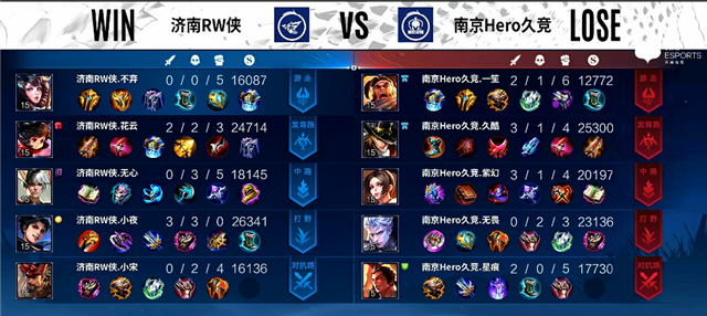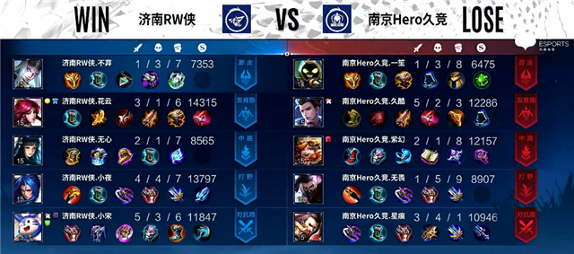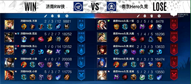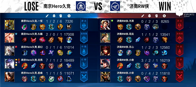 2分20秒兰陵王拿下暴君。2分50秒上路团战,曹操拿下一血。3分10秒下路团战,南京Hero久竞打出1换2。4分钟橘右京拿下主宰。4分40秒上路团战,济南RW侠打出0换2。5分20秒伽罗推掉下路一塔。6分30秒橘右京拿下暴君。7分50秒中路团战,双方1换1。8分钟橘右京拿下主宰。10分20秒兰陵王拿下主宰,橘右京拿下暴君,中路团战双方1换1。11分钟伽罗推掉中路一塔。14分40秒橘右京拿下主宰,团战双方3换3。16分30秒上路团战,双方1换1。17分27秒橘右京拿下暴君,团战济南RW侠打出1换5团灭南京Hero久竞。18分19秒济南RW侠推掉水晶拿下本场比赛胜利。