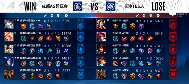 3分30秒上路团战,蒙恬拿下一血。3分45秒鲁班七号推掉下路一塔。4分钟野区团战,双方3换3。5分30秒露娜拿下暴君。6分钟河道团战,长沙TES.A打出0换3。7分28秒虞姬拿下主宰。7分40秒虞姬被击杀。8分钟野区团战双方2换2,鲁班七号推掉中路一塔。9分40秒镜拿下暴君。11分钟露娜拿下暴君,镜拿下主宰。13分钟中路团战,成都AG超玩会打出1换2。14分40秒鲁班七号拿下暴君。15分24秒露娜拿下主宰。16分40秒成都AG超玩会推掉下路高地塔,露娜被击杀。17分21秒虞姬推掉中路一塔。18分40秒露娜拿下暴君。21分钟鲁班七号推掉中路高地塔。22分钟中路团战,长沙TES.A1换5团灭成都AG超玩会。22分32秒长沙TES.A推掉水晶追回一分。