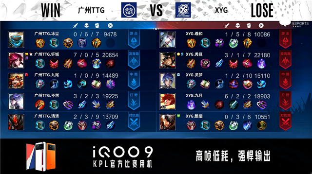 开局XYG李元芳中路抢线,广州TTG廉颇中路抢线。1分07秒广州TTG野区击杀蒙恬拿到一血。2分18秒XYG拿下暴君,广州TTG拿下主宰。3分38秒XYG对抗路击杀安琪拉。4分06秒双方中路1换1。5分50秒广州TTG摧毁敌方发育路外塔。6分42秒广州TTG拿下暴君。6分53秒XYG拿下主宰。7分35秒XYG中路击杀大乔。7分43秒XYG摧毁敌方中路外塔。8分45秒广州TTG摧毁敌方对抗路二塔。9分41秒XYG中路击杀虞姬。11分18秒广州TTG拿下暗影主宰。13分41秒广州TTG抢到暗影暴君,XYG击杀安琪拉。14分50秒广州TTG中路击杀蒙恬。15分11秒广州TTG拿下暗影主宰。15分48秒广州TTG摧毁敌方中路外塔。16分35秒野区团战双方1换1。18分31秒广州TTG拿下暗影暴君,XYG击杀廉颇。18分53秒XYG拿下暗影主宰。19分02秒XYG发育路击杀虞姬。19分24秒XYG摧毁敌方中路二塔。22分32秒龙王处团战XYG打出1换3并拿下风暴龙王。24分30秒XYG摧毁敌方水晶拿下比赛。