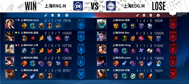1分钟河道团战,不知火舞拿下一血,上海RNG.M打出0换3。2分钟吕布被击杀。3分钟上海RNG.M入侵野区,上海EDG.M打出0换2。3分40秒盘古拿下暴君。5分21秒成吉思汗推掉下路一塔。5分钟下路团战,上海RNG.M打出0换4。5分20秒盘古拿下主宰。7分30秒上海RNG.M入侵野区,团战打出0换2。8分钟中路团战,上海RNG.M打出1换4。9分钟澜拿下暴君。10分钟成吉思汗推掉中路二塔。10分22秒澜拿下主宰。11分10秒成吉思汗推掉中路高地塔。13分钟上路团战,上海EDG.M打出1换3。14分钟盘古拿下主宰。15分钟下路团战,上海RNG.M打出1换2。15分40秒高地团战,上海RNG.M团灭上海EDG.M并推掉水晶追平比分。