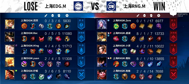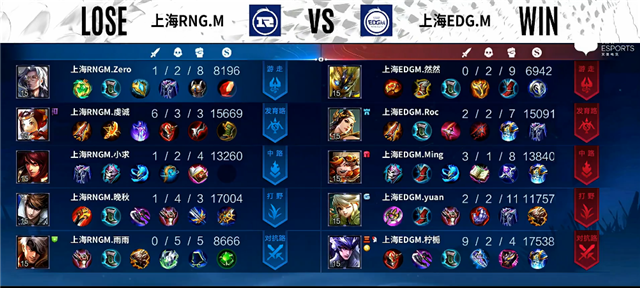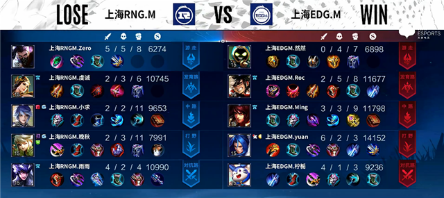 2分钟上路交火,马超拿下一血。4分钟夏侯惇被击杀。4分27秒上海EDG.M下路一塔被破。4分40秒阿古朵拿下主宰,赵云拿下暴君。5分钟上路团战,鲁班大师被击杀。7分55秒阿古朵推掉中路一塔。8分钟阿古朵拿下暴君。10分50秒阿古朵拿下主宰。11分35秒虞姬推掉上路二塔。11分45秒中路团战,上海RNG.M打出1换2。12分钟上海EDG.M推掉上路高地塔。13分30秒赵云拿下暴君。14分55秒鲁班七号推掉中路一塔。15分钟主宰团,上海EDG.M打出0换2,赵云拿下主宰。16分钟下路团战,上海RNG.M打出2换3。17分钟赵云拿下暴君。18分50秒鲁班七号推掉中路高地塔。20分钟中路团战,双方3换3。22分钟中路团战,马超拿下三杀,上海EDG.M团灭上海RNG.M。23分钟上海EDG.M推掉水晶率先拿下一分。