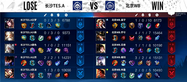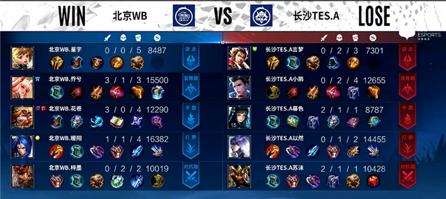 4分10秒镜拿下暴君。5分17秒镜推掉上路一塔。6分50秒镜拿下主宰。9分钟镜抢下暴君,北京WB下路一塔被破。12分钟野区团战,马可波罗拿下一血,北京WB打出0换2。13分钟主宰团,镜拿下主宰,团战长沙TES.A打出0换2。13分45秒老夫子推掉中路一塔。14分钟上路团战,北京WB打出0换2。14分55秒马可波罗推掉中路一塔。16分30秒上路团战,北京WB打出2换3。17分20秒镜拿下暴君。18分45秒镜拿下主宰。19分钟下路团战,北京WB打出0换4。19分28秒北京WB推掉水晶率先拿下一分。
