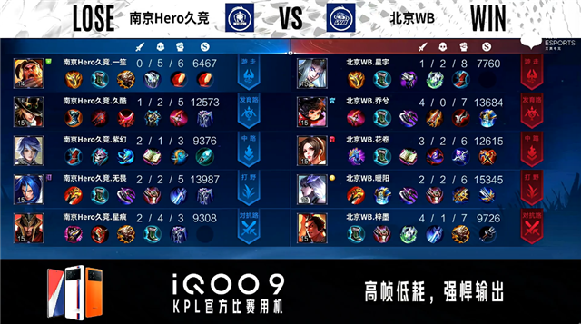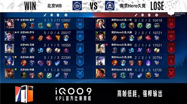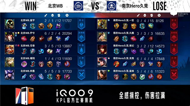 双方常规开局。7分08秒北京WB对抗路击杀孙尚香拿到一血。8分32秒北京WB摧毁敌方对抗路二塔。8分40秒北京WB拿下暴君。10分38秒南京Hero拿下暗影主宰。10分47秒北京WB摧毁敌方中路外塔。11分01秒野区团战北京WB打出0换2。12分46秒双方对抗路1换1。12分58秒北京WB摧毁敌方发育路二塔并击杀吕布。15分58秒野区团战北京WB打出2换3。16分25秒北京WB摧毁敌方中路二塔。16分44秒北京WB中路击杀嬴政。17分17秒北京WB拿下暗影主宰。19分02秒北京WB拿下暗影暴君。19分48秒北京WB对抗路击杀张飞。20分43秒北京WB拿下风暴龙王。21分39秒野区团战南京Hero击杀大乔。23分53秒中路团战北京WB击杀镜。24分32秒北京WB拿下风暴龙王。31分25秒北京WB摧毁敌方水晶拿下比赛。