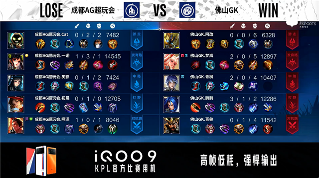 双方常规开局。1分19秒发育路团战佛山GK打出1换2。1分51秒成都AG发育路击杀虞姬。2分06秒佛山GK中路击杀沈梦溪。2分23秒成都AG抢到暴君并击杀牛魔。3分16秒佛山GK对抗路击杀娜可露露。6分30秒野区团战佛山GK打出2换3。6分69秒佛山GK拿下主宰。7分59秒野区团战佛山GK击杀伽罗。9分40秒发育路团战双方2换2。11分02秒佛山GK拿下暗影主宰。11分40秒佛山GK拿下暗影暴君。12分23秒佛山GK摧毁敌方中路二塔。12分38秒佛山GK摧毁敌方发育路高地塔。13分40秒对抗路团战佛山GK摧毁敌方对抗路高地塔并打出1换2。14分54秒对抗路团战成都AG打出2换3。16分13秒佛山GK拿下暗影暴君。16分44秒佛山GK强点敌方水晶拿下比赛。