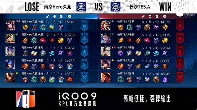 双方和平开局。4分06秒,南京Hero久竞控下先知主宰。5分25秒,长沙TES.A蒙犽击杀太乙真人拿下一血。5分57秒,长沙TES.A控下暴君,随后南京Hero久竞破掉长沙TES.A上一塔。6分48秒,长沙TES.A击杀镜。8分40秒,南京Hero久竞破掉长沙TES.A上二塔,随后击杀孙膑。9分12秒,南京Hero久竞控下先知主宰。10分17秒,南京Hero久竞控下暗影暴君。11分15秒,下路团,南京Hero久竞打出0换3,镜拿下双杀。11分40秒,南京Hero久竞破掉长沙TES.A中一塔。11分54秒,南京Hero久竞控下暗影主宰。13分钟,南京Hero久竞破掉长沙TES.A中二塔。13分22秒,南京Hero久竞中路越高地打出1换5团灭对手,镜拿下三杀。13分38秒,南京Hero久竞摧毁长沙TES.A水晶扳回一城。