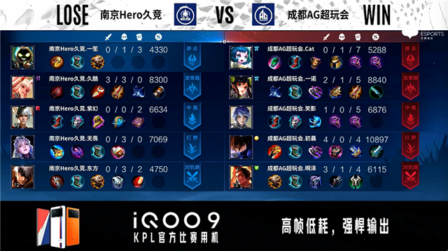 开局成都AG边路换线。53秒南京Hero发育路击杀蒙恬拿到一血。2分13秒南京Hero拿下暴君。4分04秒南京Hero拿下主宰。4分37秒南京Hero主宰处击杀娜可露露。4分56秒南京Hero野区击杀嬴政。5分07秒南京Hero中路击杀蒙恬。8分44秒南京Hero拿下主宰。9分整双方中路1换1,成都AG摧毁敌方发育路二塔。10分33秒成都AG抢到暗影主宰。11分56秒南京Hero拿下暗影暴君。13分17秒南京Hero中路击杀马可波罗并摧毁中路二塔。15分14秒南京Hero拿下暗影主宰。16分51秒南京Hero拿下暗影暴君。17分54秒成都AG中路击杀橘右京。19分整中路团战双方1换1。19分20秒成都AG拿下暗影主宰。20分15秒成都AG摧毁敌方对抗路二塔。20分36秒成都AG摧毁敌方对抗路高地塔。21分38秒中路团战成都AG击杀盾山。22分33秒成都AG拿下风暴龙王。23分04秒成都AG摧毁敌方发育路高地塔。23分52秒高地团战成都AG击杀盾山。24分03秒高地团战双方1换1。28分02秒成都AG摧毁敌方水晶拿下比赛。