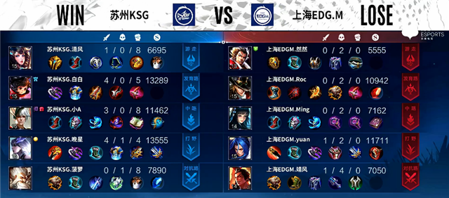 3分钟澜拿下暴君。4分钟上路团战,吕布拿下一血。5分钟娜可露露拿下主宰。5分50秒鲁班七号推掉下路一塔。7分钟澜拿下暴君。7分30秒中路团战,吕布被击杀。9分钟澜拿下暴君,娜可露露拿下主宰。10分20秒野区团战,上海EDG.M打出1换3。13分10秒河道团战,盾山被击杀。14分20秒娜可露露拿下暴君。14分30秒澜拿下主宰。15分20秒中路团战,苏州KSG打出2换4。17分20秒中路团战,苏州KSG团灭上海EDG.M。18分12秒苏州KSG推掉水晶拿下本场比赛胜利。