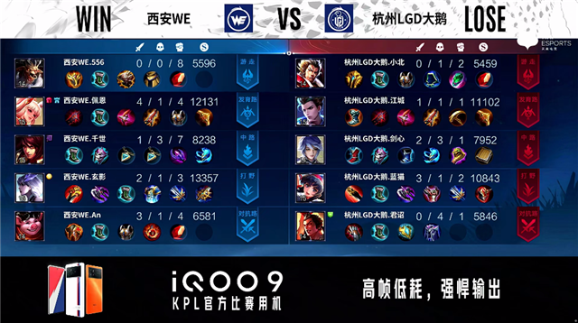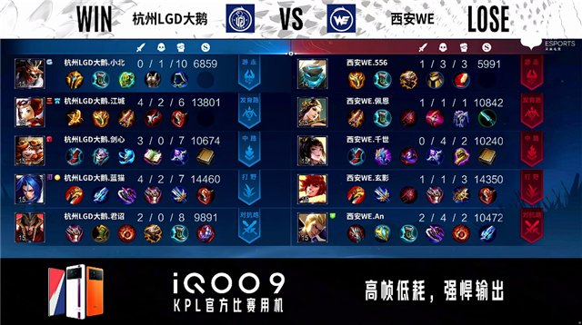 58秒,西安WE狂铁击杀入侵野区的橘右京拿下一血。1分15秒,杭州LGD大鹅蒙恬击杀狂铁。2分36秒,杭州LGD大鹅控下暴君。3分34秒,下路团战双方1换1。5分39秒,杭州LGD大鹅破掉西安WE下一塔。6分36秒,杭州LGD大鹅破掉西安WE中一塔并打出0换2。10分12秒,杭州LGD大鹅控下暗影暴君,随后团战杭州LGD大鹅打出2换4,鲁班七号拿下三杀。11分钟,杭州LGD大鹅破掉西安WE下二塔及下高地。11分40秒,野区团,杭州LGD大鹅击杀上官婉儿,随后破掉西安WE上二塔。12分10秒,杭州LGD大鹅破掉西安WE中二塔,随后破掉西安WE上高地及中高地。13分钟,西安WE击杀鲁班七号。13分35秒,西安WE控下暗影主宰。14分05秒,杭州LGD大鹅控下暗影暴君。17分34秒,杭州LGD大鹅控下暗影主宰。16分钟,杭州LGD大鹅控下暗影暴君,随后团战打出0换4。16分32秒,杭州LGD大鹅摧毁西安WE水晶赢下比赛。