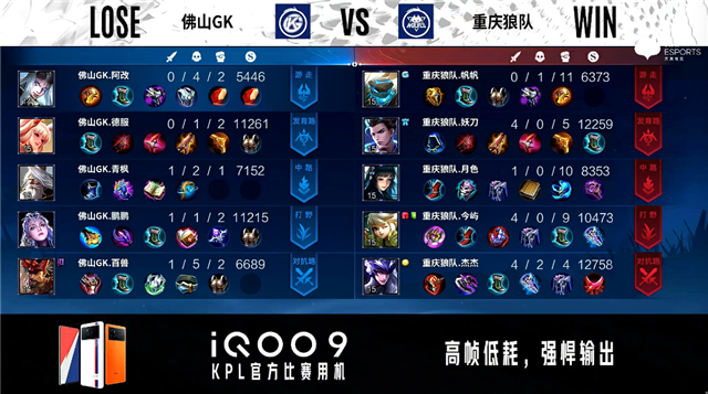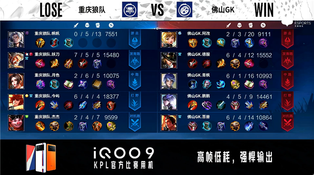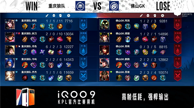 开局佛山GK边路换线。1分33秒佛山GK中路击杀不知火舞拿到一血。2分07秒重庆狼队对抗路击杀马可波罗。3分13秒野区团战双方打出3换3。6分41秒中路团战佛山GK击杀黄忠并摧毁中路外塔。7分24秒佛山GK拿下暴君。8分50秒野区团战重庆狼队打出0换2。10分11秒中路团战双方2换2。10分45秒中路团战佛山GK打出0换2。11分07秒佛山GK拿下暗影主宰。12分46秒佛山GK摧毁敌方发育路二塔。12分55秒佛山GK拿下暗影暴君。15分13秒佛山GK拿下暗影主宰并打出0换3。15分56秒双方中路1换1。16分25秒高地团战双方2换2。17分20秒佛山GK中路击杀不知火舞。17分54秒中路团战佛山GK击杀猪八戒。18分54秒佛山GK拿下暗影主宰,团战重庆狼队打出2换3。20分43秒中路团战佛山GK打出2换4。21分36秒佛山GK摧毁敌方水晶拿下比赛。