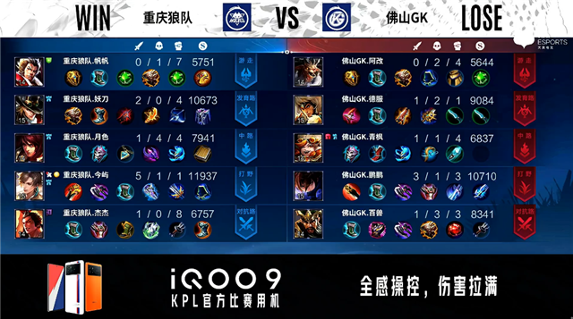 开局佛山GK公孙离中路抢线。5分16秒佛山GK拿下暴君。5分50秒对抗路团战重庆狼队打出1换2。7分19秒佛山GK摧毁敌方对抗路外塔。8分24秒重庆狼队摧毁敌方中路外塔。9分32秒重庆狼队拿下暴君。9分40秒野区团战双方1换1。11分31秒野区团战重庆狼队打出1换4。12分18秒重庆狼队高地打出0换2。12分50秒高地团战重庆狼队击杀东皇太一。13分21秒重庆狼队拿下暗影暴君。14分51秒重庆狼队拿下暗影主宰。15分48秒重庆狼队摧毁敌方对抗路二塔。16分05秒对抗路团战重庆狼队打出0换2并摧毁对抗路高地塔。16分40秒重庆狼队摧毁敌方水晶拿下比赛。