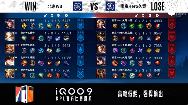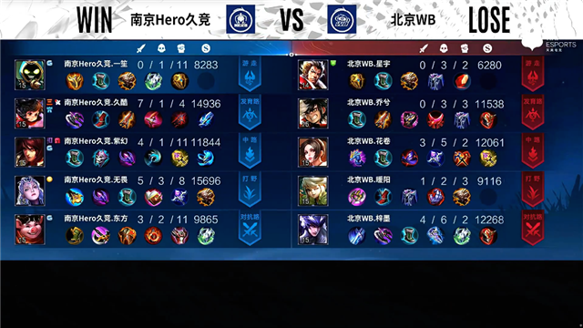 2分10秒野区团战,镜拿下一血。3分20秒下路团战,北京WB打出0换2。4分钟橘右京拿下主宰,镜拿下暴君。5分钟下路团战,南京Hero久竞打出0换2。5分40秒马可波罗被击杀。6分18秒北京WB下路一塔被破。7分30秒伽罗推掉上路一塔。7分50秒橘右京拿下主宰。8分10秒野区团战,南京Hero久竞打出0换2。8分30秒伽罗推掉中路一塔。9分50秒吕布被击杀。10分27秒橘右京拿下主宰。11分钟中路团战,北京WB打出1换2。12分钟中路团战,北京WB打出3换5团灭南京Hero久竞。12分20秒镜推掉中路一塔。12分42秒镜拿下暴君。14分钟中路团战,北京WB打出1换2。16分钟伽罗被击杀。16分33秒镜拿下主宰,马可波罗拿下暴君。18分钟镜推掉上路高地塔。20分20秒镜拿下风暴龙王,团战双方3换3。22分29秒马可波罗推掉下路高地塔。24分钟野区团战,南京Hero久竞打出1换2。25分钟野区团战,南京Hero久竞打出1换3。26分钟风暴龙王团,北京WB打出0换2。27分30秒高地团战,双方2换2。28分钟中路团战,北京WB打出1换2。32分钟中路团战,镜被击杀。33分钟橘右京拿下风暴龙王,伽罗被击杀。35分钟下路团战,南京Hero久竞打出1换2。36分42秒橘右京拿下风暴龙王。37分30秒伽罗推掉下路和中路高地塔。37分40秒高地团战,双方1换1。39分钟野区团战,双方3换3。42分20秒风暴龙王团,南京Hero久竞1换5团灭北京WB。43分02秒南京Hero久竞推掉水晶率先拿下赛点。