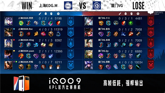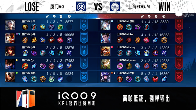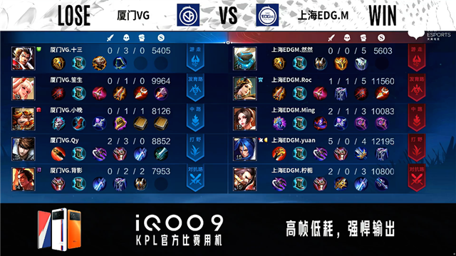 开局沈梦溪入侵野区,鲁班大师拿下一血。4分钟澜拿下暴君,马超拿下主宰。4分30秒河道团战,马超被击杀。5分38秒双方互换边路一塔。6分30秒下路团战,双方1换1,狄仁杰推掉下路一塔。8分33秒阿古朵拿下暴君。9分40秒澜拿下主宰。10分钟河道团战,上海EDG.M打出2换4。11分40秒澜拿下主宰,团战双方1换1。12分20秒阿古朵被击杀。13分钟上路团战,鲁班七号被击杀,澜推掉中路一塔。13分40秒阿古朵拿下暴君。14分钟上路团战,厦门VG打出2换3。14分40秒鲁班七号推掉中路和上路高地塔。15分40秒澜拿下主宰。17分30秒周瑜推掉下路高地塔。16分钟澜拿下暴君。18分钟野区团战,上海EDG.M打出1换4。19分30秒阿古朵拿下主宰。22分钟风暴龙王团,上海EDG.M打出2换5团灭厦门VG,马超拿下三杀。23分09秒上海EDG.M推掉水晶率先拿下一分。