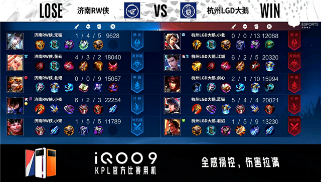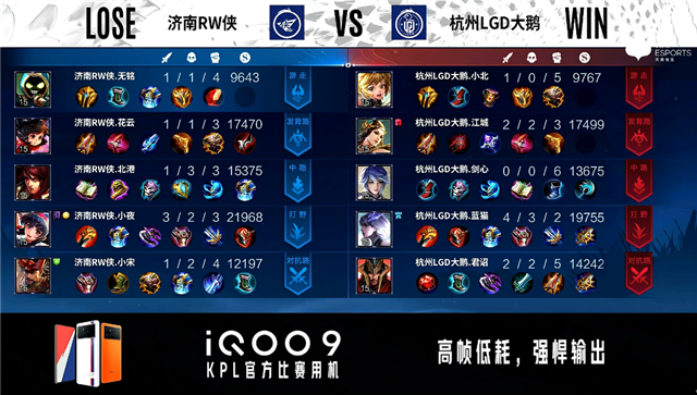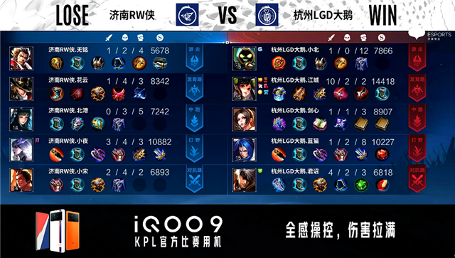 双方常规开局。3分12秒济南RW侠主宰处击杀蒙恬拿到一血。3分43秒杭州LGD大鹅拿下暴君,济南RW侠拿下主宰。5分47秒对抗路团战杭州LGD大鹅打出1换2。8分42秒中路团战杭州LGD大鹅击杀吕布。6分55秒杭州LGD大鹅摧毁敌方中路外塔。10分23秒济南RW侠发育路击杀虞姬。10分49秒济南RW侠拿下暗影主宰。12分15秒中路团战济南RW侠击杀镜。15分05秒野区团战济南RW侠打出1换2。15分40秒中路团战济南RW侠击杀虞姬。17分29秒济南RW侠摧毁敌方发育路二塔。19分24秒济南RW侠拿下暗影暴君。20分35秒济南RW侠摧毁敌方发育路高地塔。22分11秒济南RW侠拿下风暴龙王。24分03秒杭州LGD大鹅中路击杀太乙真人。25分52秒中路团战杭州LGD大鹅打出0换4。26分35秒杭州LGD大鹅摧毁敌方水晶拿下比赛。