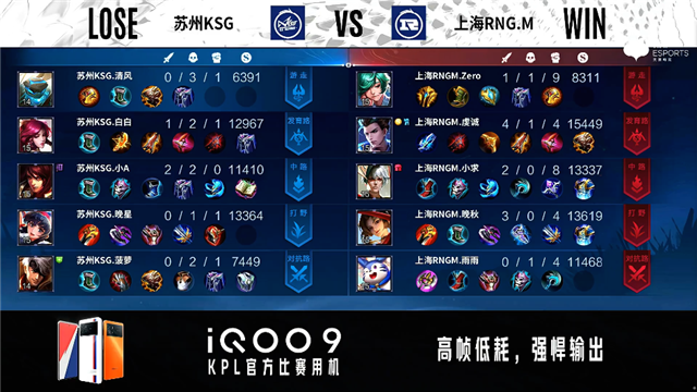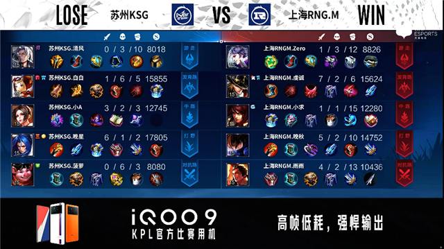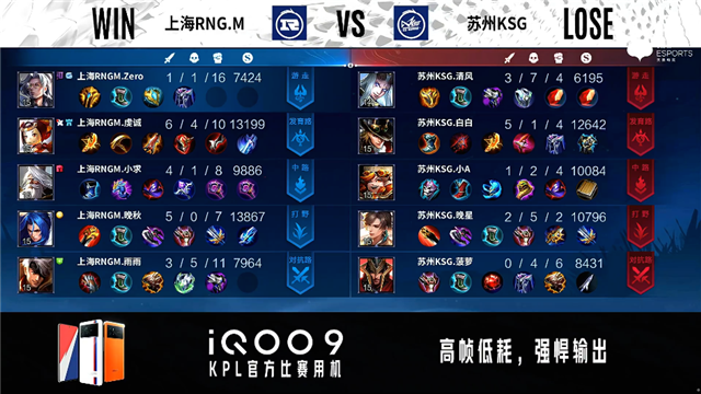3分38秒橘右京拿下暴君。3分45秒下路团战,橘右京拿下一血,团战双方1换1,鲁班七号推掉下路一塔。4分钟澜推掉上路一塔,吕布被击杀。6分钟橘右京拿下主宰。7分钟上路团战,鲁班七号被击杀。8分钟鲁班七号推掉中路一塔。8分20秒野区团战,上海RNG.M打出1换3。9分钟澜拿下暴君。10分20秒马可波罗拿下主宰,橘右京拿下暴君。11分钟野区团战,上海RNG.M打出0换2。11分40秒马可波罗推掉中路一塔。12分50秒下路团战,上海RNG.M打出0换2,上海RNG.M顺势推掉下路高地塔。14分21秒橘右京拿下暴君。16分13秒澜拿下主宰。18分20秒河道团战,苏州KSG2换5团灭上海RNG.M,橘右京拿下三杀。20分钟风暴龙王团,上海RNG.M打出0换5团灭苏州KSG。21分09秒上海RNG.M推掉水晶率先拿下一分。