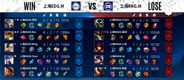 2分20秒娜可露露拿下暴君。3分钟上路团战,成吉思汗拿下一血,双方2换2。4分40秒双方互换边路一塔。5分钟娜可露露拿下主宰。6分钟嬴政推掉上路一塔。7分钟镜拿下暴君。8分30秒周瑜推掉上路二塔。9分钟嬴政推掉中路一塔。9分30秒野区团战,上海EDG.M打出1换2。10分钟娜可露露被单杀,马可波罗推掉中路一塔。10分31秒镜拿下主宰。12分20秒中路团战,上海EDG.M打出1换2。13分20秒镜拿下暴君。14分20秒中路团战,双方1换1。15分16秒成吉思汗拿下主宰。16分钟上路团战,上海RNG.M打出2换3。17分钟马可波罗拿下暴君。18分钟野区团战,上海EDG.M团灭上海RNG.M。19分02秒上海EDG.M推掉水晶拿下本场比赛胜利。