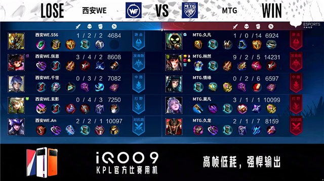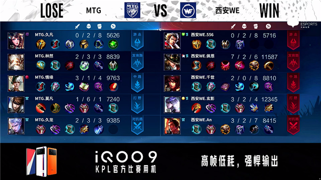 2分40秒,西安WE控下暴君,随后MTG镜击杀梦奇拿下一血。3分07秒,MTG控下先知主宰。3分55秒,中路团,双方1换1,随后MTG破掉西安WE上一塔。5分45秒,中路团,双方再次1换1。7分04秒,MTG控下暴君。7分24秒,西安WE控下先知主宰,随后团战西安WE打出2换3。7分58秒,西安WE破掉MTG中一塔。10分01秒,西安WE鲁班七号击杀猪八戒。10分29秒,西安WE控下暗影主宰。11分30秒,西安WE破掉MTG中二塔,随后团战西安WE打出0换2。11分55秒,西安WE破掉MTG中高地及下二塔。12分12秒,西安WE破掉MTG下高地。12分26秒,西安WE边团边拆摧毁MTG水晶赢下比赛。