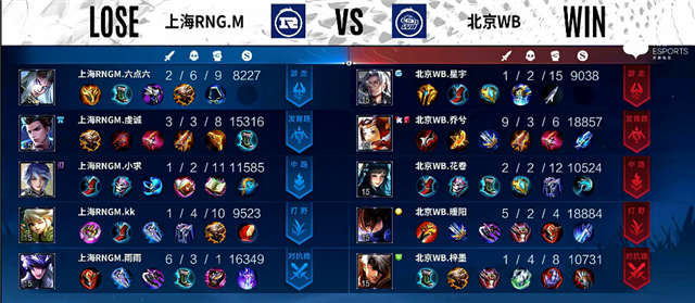 2分13秒公孙离拿下暴君,镜拿下主宰。2分30秒下路团战,不知火舞拿下一血,双方1换1。3分钟上路团战,北京WB打出0换2。4分45秒公孙离推掉下路一塔。5分20秒野区团战,北京WB打出0换3,上海RNG.M中路一塔被破。6分40秒橘右京拿下暴君。8分10秒橘右京拿下主宰。9分钟上路团战,北京WB打出0换2。10分27秒橘右京拿下暴君。11分钟橘右京拿下主宰。12分22秒上海RNG.M中路高地塔被破。12分50秒不知火舞被击杀。13分26秒公孙离被击杀。14分钟橘右京拿下暴君。14分46秒橘右京拿下主宰。15分钟公孙离推掉上路高地塔。15分34秒北京WB推掉水晶拿下本场比赛胜利。