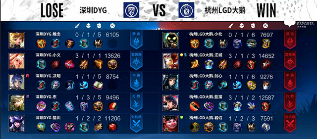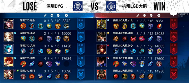 2分28秒娜可露露拿下主宰。3分14秒阿古朵拿下暴君。5分12秒猪八戒推掉上路一塔。6分10秒河道团战,猪八戒拿下一血,杭州LGD大鹅下路一塔被破。7分钟娜可露露拿下主宰。7分44秒阿古朵拿下暴君。8分钟野区团战,深圳DYG打出1换3,弈星推掉中路一塔。9分50秒阿古朵被击杀。10分50秒阿古朵拿下暴君,主宰团西施被击杀。12分57秒阿古朵拿下主宰。15分钟阿古朵拿下暴君。16分钟野区团战,杭州LGD大鹅打出1换4。17分20秒杭州LGD大鹅推掉水晶拿下本场比赛胜利。