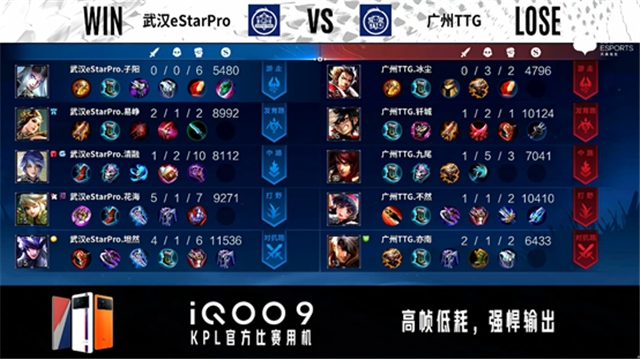 双方常规开局。2分12秒武汉eStar中路击杀夏侯惇拿到一血。2分12秒广州TTG发育路击杀虞姬。4分33秒双方主宰处打出2换2。6分19秒广州TTG中路击杀弈星。8分03秒对抗路团战武汉eStar打出0换2。10分29秒中路团战武汉eStar打出0换2。11分09秒武汉eStar摧毁敌方中路高地塔。12分19秒武汉eStar对抗路击杀张飞。14分32秒武汉eStar马超偷家摧毁水晶拿下比赛。