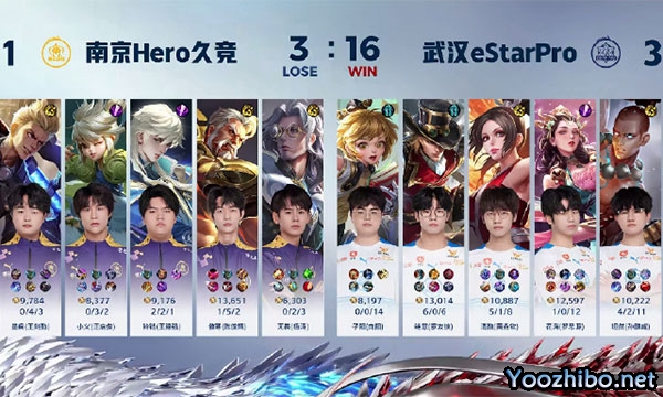 10分钟,武汉eStarPro中路开团,清融(黄垚钦)不知火舞和 武汉eStar绝意 (廖友侠)马可波罗接连收下二连击破,顺势拔掉对方中路高地;13分钟,不知火舞一闪进场控制三人,但 南京Hero无畏 (杨涛)鲁班大师反拉防守成功,留下对方二人;16分40秒,坦然(孙麟威)达摩再度进场切死黄忠,使对方失去输出点,全队冲破水晶,拿到本场比赛的胜利,拿下大场五连胜!