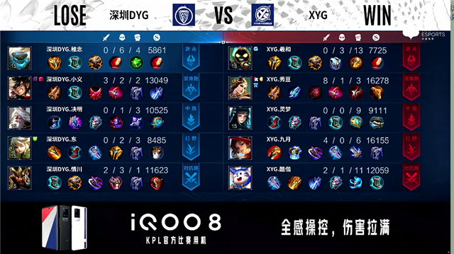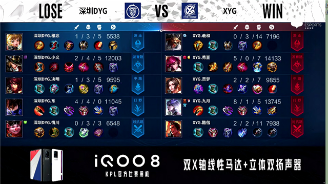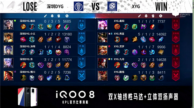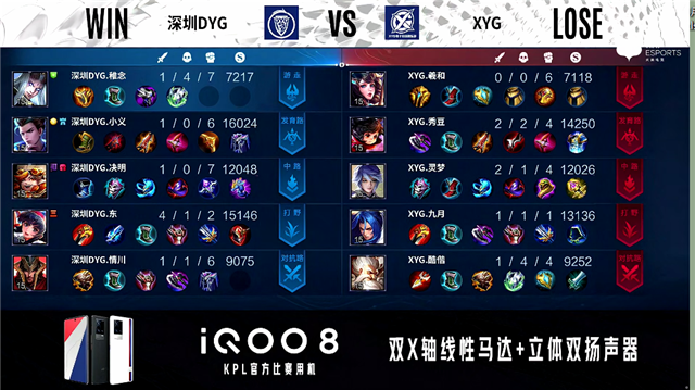 2分49秒,深圳DYG蒙犽击杀太乙真人拿下一血。3分02秒,深圳DYG控下暴君。3分35秒,XYG控下先知主宰。4分40秒,深圳DYG破掉XYG下一塔,XYG上路越塔击杀关羽。6分19秒,XYG破掉深圳DYG下一塔,随后深圳DYG破掉XYG上一塔。7分02秒,野区团,双方最终1换1。7分35秒,深圳DYG控下暴君。8分02秒,深圳DYG破掉XYG中一塔。8分26秒,深圳DYG控下先知主宰。10分21秒,中路团,双方1换1。11分52秒,双方团,XYG击杀盾山,深圳DYG小兵破掉XYG上二塔。12分34秒,XYG控下暗影暴君。14分40秒,双方团战2换2,关羽拿下双杀。16分23秒,深圳DYG小兵摧毁XYG下二塔。17分51秒,XYG击杀蒙犽。18分30秒,XYG控下暗影主宰,随后击杀盾山并破掉深圳DYG中一塔。19分30秒,XYG破掉深圳DYG上二塔。19分54秒,上路团,XYG打出0换5团灭对手。20分16秒,XYG上路一波摧毁深圳DYG水晶率先拿到赛点。