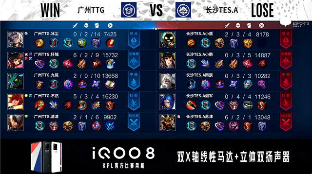 双方常规开局。2分18秒广州TTG拿下主宰。3分41秒广州TTG野区击杀姜子牙拿到一血。3分51秒广州TTG拿下暴君。5分41秒长沙TES.A发育路祭祀哈裴擒虎。5分55秒广州TTG摧毁敌方对抗路二塔。6分18秒广州TTG野区打出0换2。7分57秒广州TTG中路击杀孙尚香。8分27秒长沙TES.A发育路击杀李元芳。8分59秒长沙TES.A拿下暴君。10分24秒双方中路1换1。11分24秒长沙TES.A拿下暗影主宰,广州TTG拿下暗影暴君。12分44秒广州TTG摧毁敌方中路二塔。13分48秒中路团战广州TTG打出1换2。15分42秒广州TTG对抗路击杀橘右京。15分51秒广州TTG对抗路击杀孙尚香。16分21秒广州TTG摧毁敌方中路、对抗路高地塔,团战广州TTG击杀姜子牙。18分28秒发育路团战长沙TES.A打出0换2。19分02秒长沙TES.A击杀裴擒虎。20分09秒中路团战广州TTG团灭对手。20分39秒广州TTG摧毁敌方水晶拿下比赛。