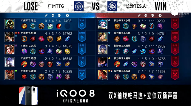 开局广州TTG入侵野区反掉红BUFF。1分10秒广州TTG中路击杀澜拿到一血。5分19秒广州TTG野区击杀蔡文姬。6分28秒长沙TES.A中路击杀镜。7分整长沙TES.A拿下主宰。9分48秒长沙TES.A野区击杀太乙真人。10分29秒广州TTG野区打出0换2。 12分05秒广州TTG摧毁敌方对抗路二塔。14分11秒广州TTG拿下暗影暴君。14分44秒野区团战长沙TES.A打出0换2。16分38秒广州TTG不知火舞对抗路单杀澜。17分19秒广州TTG摧毁敌方中路外塔。18分37秒广州TTG拿下暗影暴君。20分15秒长沙TES.A野区击杀不知火舞。20分56秒长沙TES.A击杀廉颇并拿下风暴龙王。21分50秒发育路团战长沙TES.A打出1换3。22分30秒长沙TES.A强点水晶拿下比赛。