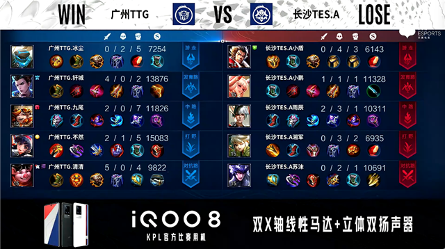 双方常规开局。1分51秒广州TTG对抗路击杀马超拿到一血。2分45秒广州TTG中路击杀嬴政。3分37秒广州TTG对抗路打出0换2。6分57秒双方野区1换1。7分18秒广州TTG野区击杀阿古朵。7分29秒广州TTG摧毁敌方中路外塔。8分15秒广州TTG拿下暗影主宰。8分48秒广州TTG对抗路击杀张飞。9分08秒广州TTG摧毁敌方对抗路二塔。9分57秒广州TTG拿下暗影暴君。10分51秒广州TTG摧毁敌方发育路二塔并击杀张飞。11分03秒广州TTG摧毁敌方中路二塔。16分19秒中路团战双方1换1。16分50秒长沙TES.A对抗路击杀娜可露露。17分46秒广州TTG主宰处打出0换2。18分27秒广州TTG摧毁敌方水晶拿下比赛。