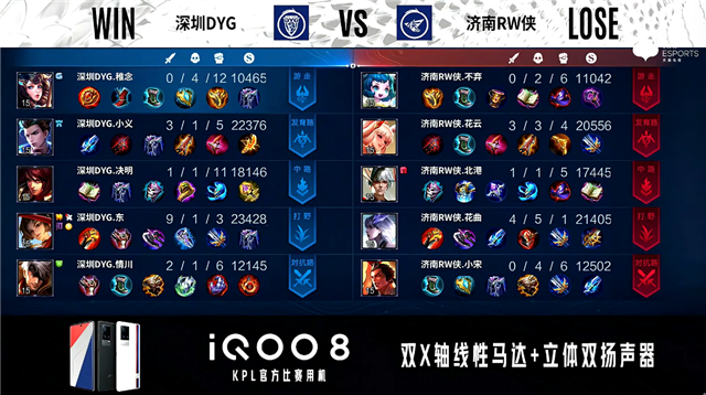 开局深圳DYG吕布走中。2分37秒深圳DYG拿下主宰。3分33秒深圳DYG发育路击杀虞姬拿到一血。4分05秒济南RW侠发育路击杀上官婉儿。4分25秒济南RW侠野区打出0换2。4分44秒济南RW侠拿下暴君。5分09秒深圳DYG发育路击杀孙膑。6分03秒中路团战深圳DYG击杀孙膑。7分整深圳DYG拿下主宰。7分13秒济南RW侠橘右京发育路单杀上官婉儿。9分03秒深圳DYG暴君处击杀夏侯惇。9分16秒深圳DYG发育路击杀橘右京。9分33秒深圳DYG拿下暴君。10分50秒深圳DYG中路击杀孙膑。13分20秒深圳DYG野区击杀橘右京。15分05秒中路团战深圳DYG打出2换3。17分44秒野区团战深圳DYG击杀橘右京。19分04秒深圳DYG拿下暗影暴君。19分35秒深圳DYG摧毁敌方中路二塔。20分34秒中路团战深圳DYG打出1换4。21分16秒深圳DYG摧毁敌方水晶拿下比赛。