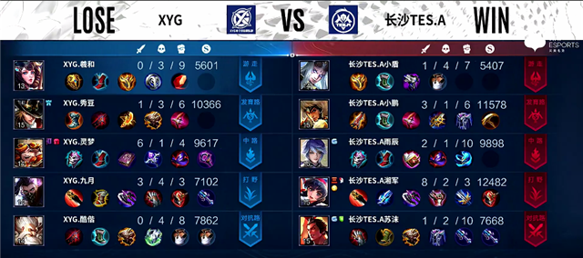 开局XYG入侵野区,沈梦溪拿下一血,双方1换1。1分50秒XYG强攻上路一塔,吕布被击杀。4分钟娜可露露拿下暴君,兰陵王拿下主宰。4分10秒下路团战,长沙TES.A打出2换4,娜可露露拿下三杀。5分20秒娜可露露入侵野区,拿下双杀。5分40秒双方互换边路一塔。6分15秒老夫子推掉上路一塔。6分40秒吕布推掉中路一塔。8分钟长沙TES.A入侵野区,团战打出1换2。8分40秒娜可露露拿下暴君。9分10秒娜可露露拿下主宰。10分20秒娜可露露拿下暴君。10分45秒老夫子推掉上路二塔。11分55秒成吉思汗推掉上路二塔。12分12秒娜可露露拿下主宰。12分30秒上路团战,XYG打出1换4。13分45秒下路团战,长沙TES.A打出1换4。14分17秒长沙TES.A推掉水晶拿下本场比赛胜利。