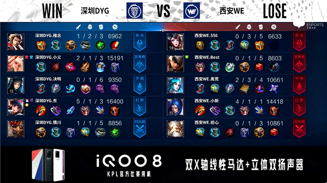 双方常规开局。2分59秒西安WE拿下暴君。3分05秒野区团战双方1换1,深圳DYG拿到一血。7分58秒深圳DYG拿下暴君。9分42秒深圳DYG拿下主宰。10分51秒深圳DYG拿下暗影暴君。12分整深圳DYG摧毁敌方对抗路二塔。12分24秒深圳DYG摧毁敌方发育路二塔。12分42秒西安WE拿下暗影主宰。13分43秒中路团战西安WE打出1换2。14分34秒西安WE摧毁敌方中路外塔。15分05秒深圳DYG中路击杀白起。15分42秒深圳DYG击杀周瑜并拿下暗影暴君。15分58秒深圳DYG摧毁敌方中路外塔。17分14秒深圳DYG拿下暗影主宰。17分48秒深圳DYG摧毁敌方中路二塔。19分54秒西安WE中路击杀沈梦溪。20分26秒西安WE拿下风暴龙王,深圳DYG摧毁敌方对抗路高地塔。20分54秒西安WE对抗路击杀马超。20分03秒团战西安WE击杀太乙真人并摧毁敌方对抗路高地塔。22分47秒西安WE摧毁敌方中路高地塔。24分15秒中路团战西安WE打出0换4。24分33秒西安WE摧毁敌方水晶拿下比赛。