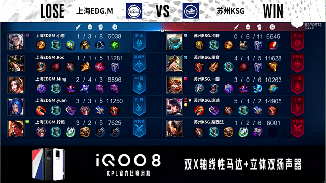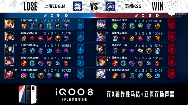 2分32秒,上海EDG.M控下先知主宰。2分43秒,苏州KSG控下暴君,双方团战1换1。5分33秒,中路团,上海EDG.M打出1换2,吕布拿下双杀。6分30秒,上海EDG.M击杀盾山。7分13秒,苏州KSG娜可露露上路蹲杀不知火舞。7分38秒,苏州KSG中路打出1换2,随后破掉上海EDG.M中一塔。7分58秒,苏州KSG控下暴君,随后上海EDG.M控下先知主宰。8分35秒,苏州KSG击杀橘右京。9分50秒,上路团,上海EDG.M打出1换2。10分39秒,苏州KSG拿到暗影暴君,随后团战苏州KSG打出0换2。11分16秒,苏州KSG破掉上海EDG.M中二塔。12分16秒,苏州KSG控下暗影主宰。13分08秒,上海EDG.M击杀盾山。14分32秒,苏州KSG破掉上海EDG.M下二塔。15分05秒,苏州KSG控下暗影暴君。15分50秒,苏州KSG破掉上海EDG.M中高地。16分02秒,苏州KSG破掉上海EDG.M上高地,随后团战苏州KSG打出2换4,娜可露露拿下三杀。16分47秒,苏州KSG摧毁上海EDG.M水晶先下一城。