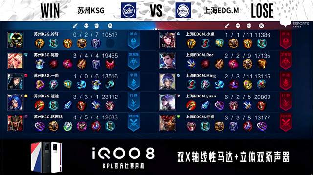 2分34秒,上海EDG.M孙膑击杀刘邦拿下一血。3分07秒,苏州KSG控下先知主宰,随后上海EDG.M控下暴君。3分38秒,苏州KSG团战打出0换2。4分37秒,上海EDG.M击杀梦奇,苏州KSG破掉上海EDG.M下一塔。6分12秒,中路团,苏州KSG打出1换2。7分23秒,上海EDG.M控下暴君,随后苏州KSG控下先知主宰。8分26秒,苏州KSG破掉上海EDG.M中一塔。10分19秒,苏州KSG控下暗影暴君,随后团战打出0换2。10分43秒,苏州KSG破掉上海EDG.M中二塔。12分01秒,苏州KSG控下暗影主宰。12分48秒,苏州KSG破掉上海EDG.M上二塔。14分38秒,苏州KSG控下暗影暴君。16分22秒,苏州KSG控下暗影主宰。17分20秒,苏州KSG破掉上海EDG.M上高地,随后团战双方1换1。18分54秒,苏州KSG控下暗影暴君。19分24秒,上海EDG.M击杀刘邦。20分05秒,双方团,苏州KSG打出2换3。21分11秒,苏州KSG控下风暴龙王。22分13秒,苏州KSG破掉上海EDG.M中高地,随后边团边拆摧毁上海EDG.M水晶赢下比赛。
