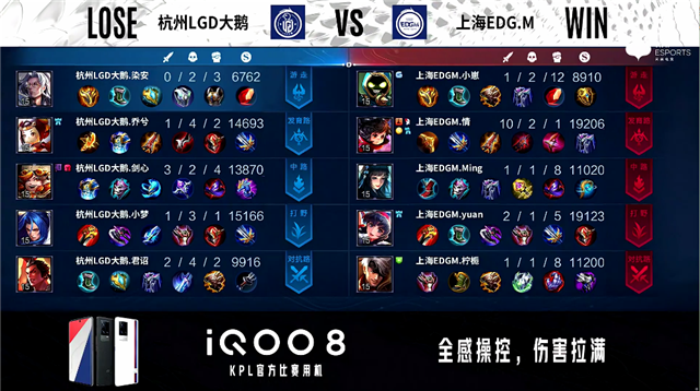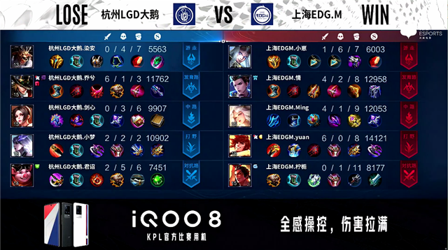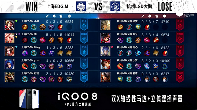 3分20秒,上海EDG.M控下暴君,随后杭州LGD大鹅控下先知主宰。3分45秒,河道团,上海EDG.M打出1换2,公孙离拿下双杀。4分46秒,杭州LGD大鹅下路击杀张飞。6分13秒,杭州LGD大鹅击杀张飞。6分58秒,杭州LGD大鹅破掉上海EDG.M上一塔。7分30秒,双方团,上海EDG.M打出1换2。7分57秒,上海EDG.M控下暴君。8分40秒,杭州LGD大鹅控下先知主宰。9分42秒,杭州LGD大鹅击杀张飞。10分29秒,杭州LGD大鹅控下暗影暴君,随后上海EDG.M控下暗影主宰。11分10秒,上海EDG.M打出0换3,随后破掉杭州LGD大鹅中路两座外塔。11分47秒,上海EDG.M破掉杭州LGD大鹅上二塔。13分45秒,杭州LGD大鹅野区击杀关羽。14分45秒,双方团,上海EDG.M打出1换4。15分11秒,上海EDG.M中路一波摧毁杭州LGD大鹅水晶赢下比赛。